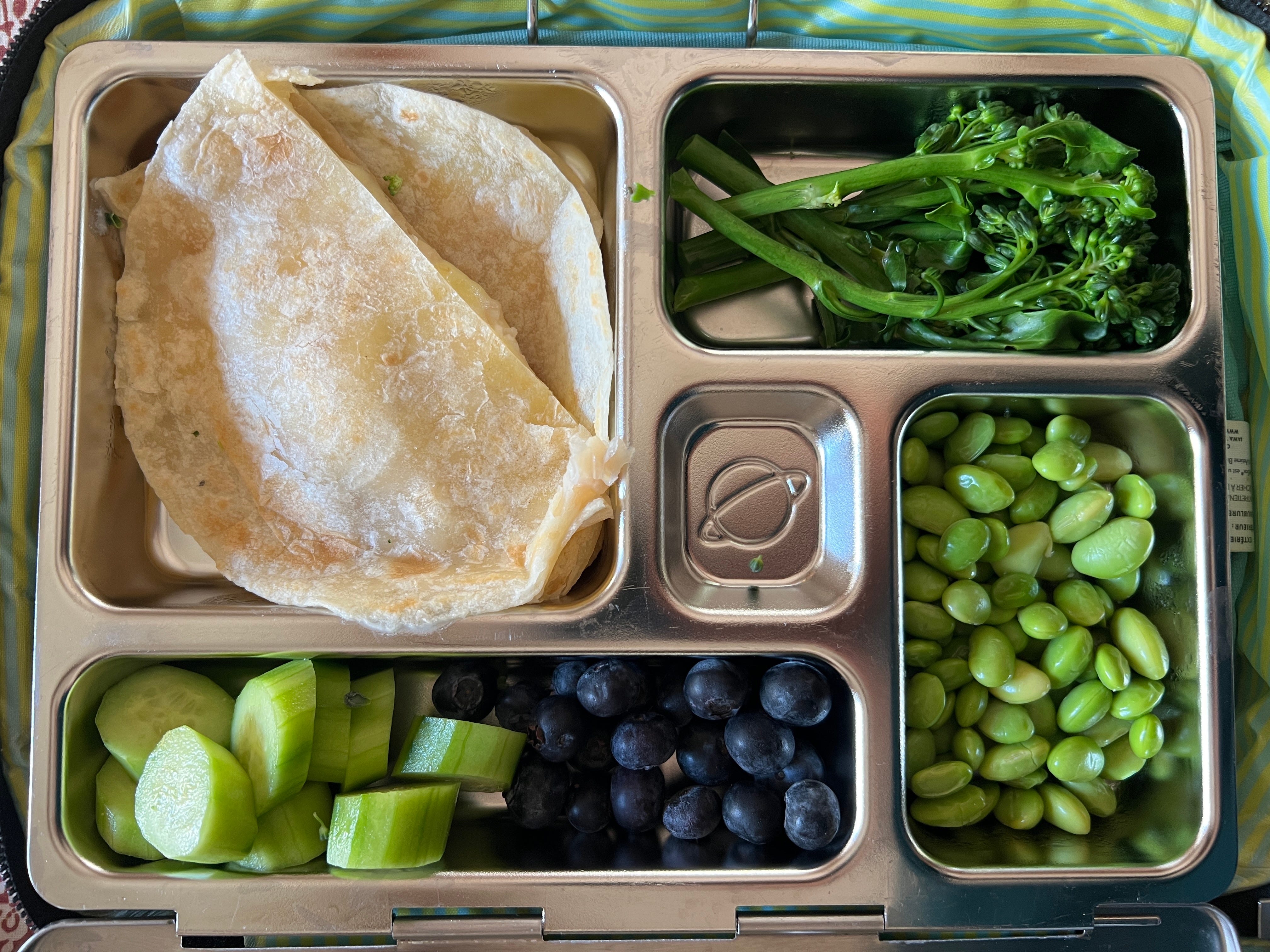 Oh hey, what’s this? Another quesadilla, this time on a flour tortilla. Did the recipient give a crap that she’d had a quesadilla in yesterday’s lunch as well? Nope. Plus leftover blanched broccolini, frozen edamame (defrosted quickly in a splash of boiling water), cucumbers and blueberries.