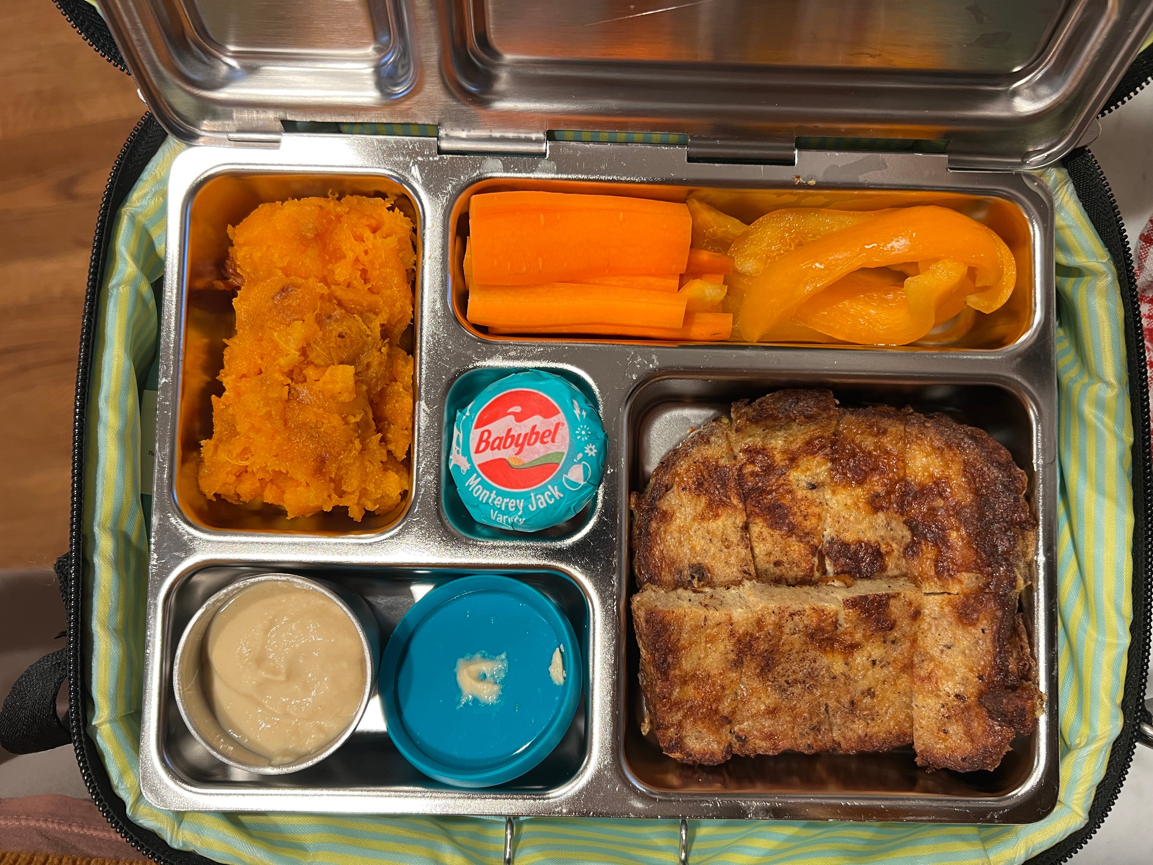 A symphony of beige for Fanny’s daughter! Leftover roasted kabocha squash mash, leftover french toast (see recipe below), and a Babybel cheese is joined by ever-popular carrot sticks and yellow bell pepper batons for all their hummus-dipping glory! The PlanetBox Rover Little Dipper for the win!