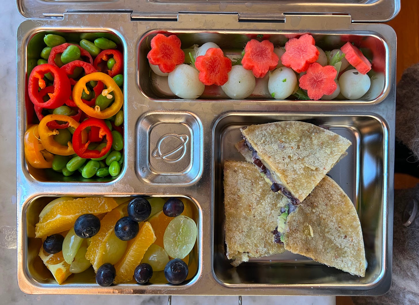 Well, well, well, what do we have here? A quesadilla, but this one has leftover black beans smashed into it, too. Plus edamame, and sliced mini peppers, fruit salad of oranges, grapes and blueberries, blanched Tokyo turnips and carrots that aren’t regular carrots, they’re cool carrots (cut in a flower shape with these little cuties).
