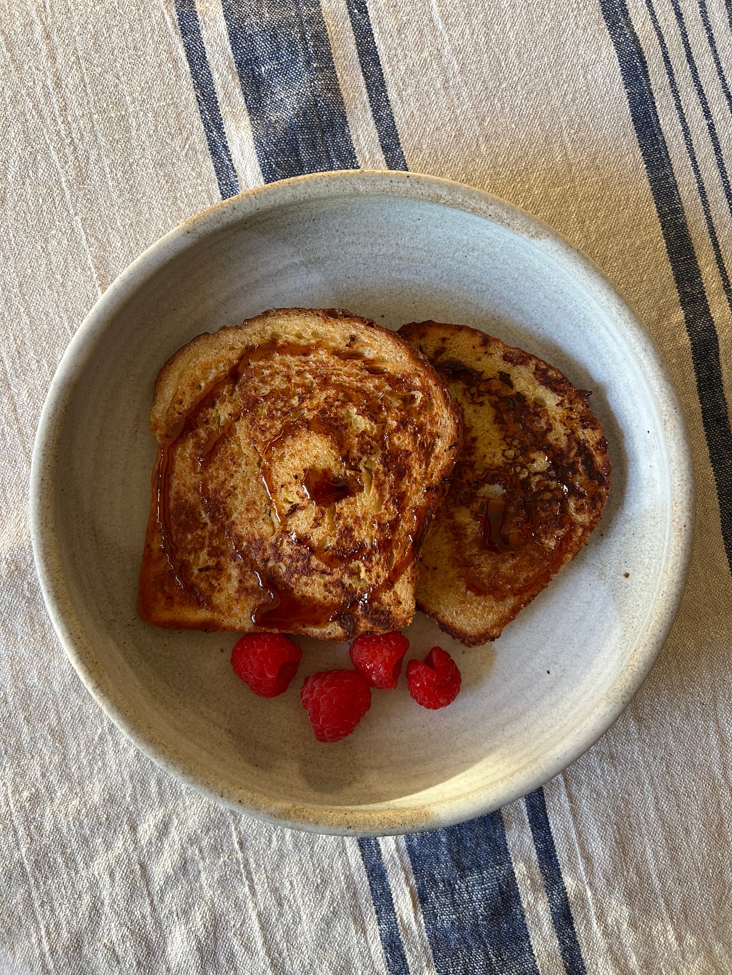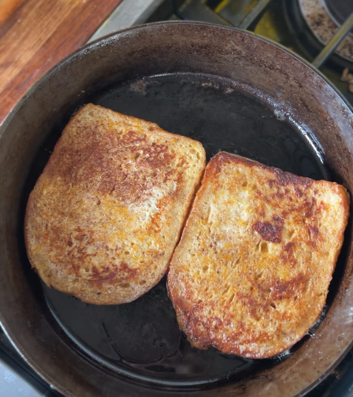 Heat a griddle, or a nonstick ceramic or cast iron pan to medium-high and add a tablespoon or so of butter. When it’s melted, add the soaked bread and cook each side for around 5 minutes or until delightfully browned. Turn down the heat slightly midway through. Repeat with the remaining butter and bread, if necessary.