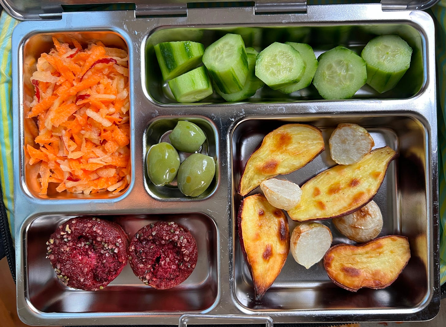 Grated carrots and apples with a squeeze of lemon and a dash of olive oil. Olives, duh. Mini roasted Japanese sweet potatoes and Tokyo turnips (leftover from dinner) and two beet-raspberry mini muffins (a recipe test in action). Cucumbers….because they’re green.