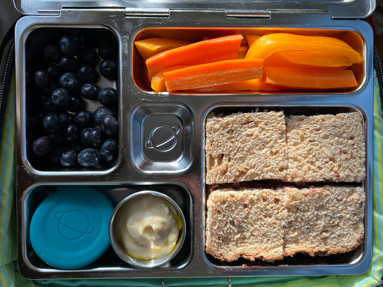 A PB + J made with Alvarado Street Bakery Sliced California Style Complete Protein Bread and some blueberries is rounded out by—you guessed it!—more carrots and peppers, this time with a white bean purée (canned white beans blitzed with garlic + olive oil + salt)